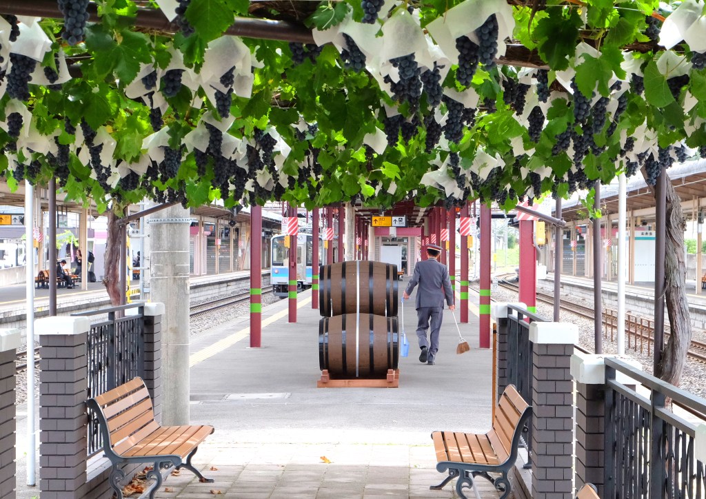 Votano Wine is located in Shiojiri City. If you choose to get there by choo-choo, you will be pleasantly surprised by Shiojiri Station, because they let it all hang out there. No, it’s not like the people on the platform are ultra-casual saggy-pants types: it is because the station doubles as a vineyard! Other stations may have pigeon spikes, but this one has grapes, grapes that are used for winemaking. Niagara and Merlot are currently being grown on the viticultural platforms, 2 and 3, respectively. The station has enjoyed its unique dual status since 1988.