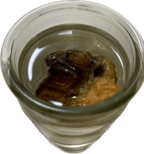 The hire-zake we tasted was made by Kizakura, a major sake brewery located in Kyoto. It is pictured below, along with the box it came in, which features an interesting backstory. It has, unsurprisingly, a fishy nose. On the palate, it is a futsū-shu (ordinary sake), whose flavor has been enhanced by both the presence of the fin and the heating process. The ABV is 16%. The overall experience is quite pleasant especially, for some reason, in winter. There is a subtle soup-like quality to the drink.