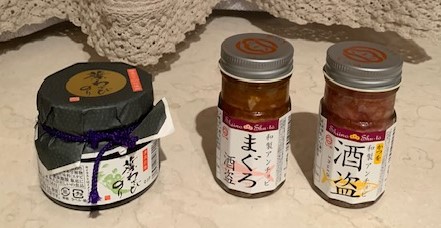 We tasted four Shiino products: Maguro Shuto (Tuna Shuto) , Katsuo Shuto (Bonito Shuto) and Hawasabi Nori (a seaweed-wasabi garnish/spread prepared in the tsukudani style). These items are pictured above, along with our beverage of choice for this tasting, Vintage Seifuku Awamori (請福), another JFEX Gem and next week’s featured entry. The fourth product is reviewed in the penultimate paragraph. The tasters in this case were three people, all of whom are thoroughly familiar with and appreciative of Japanese cuisine.