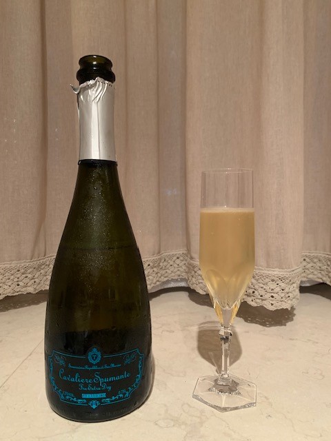 The wine featured this week is called Cavaliere Spumante Tre Extra Dry. From the “Spumante,” you might think it is Italian, but if you read the introduction to this entry, you will know it is from San Marino. This is a blanc de blancs, which is almost always made with 100% Chardonnay, as this wine is. There is some skin contact (nothing wrong with that, either!) during the production process, which gives this bubbly a degree of complexity, and the effervescence is long-lasting and pleasant. Some lees exposure adds to the mouthfeel. The alcohol is 12% by volume. The “Extra Dry” label may be a bit misleading, as we found it to have a very appealing sweetness.
