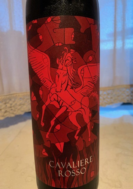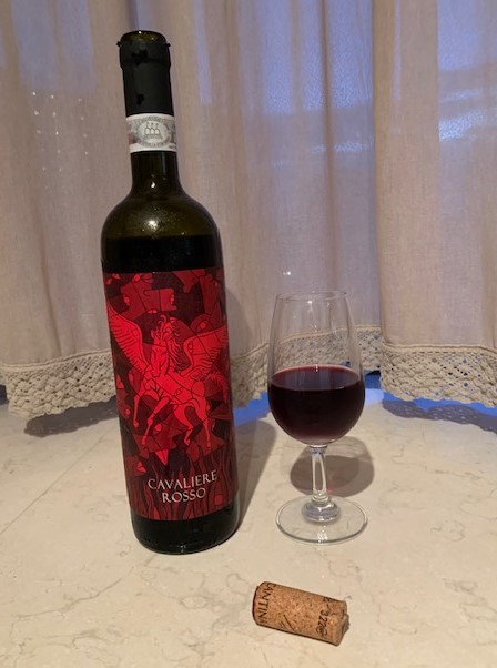 Cavaliere Rosso is a ruby-colored, 100%-Sangiovese wine with an ABV of 13%. Cherry is prominent on the nose, with hints of raspberry and strawberry. The palate is medium-intensity cherry. We found it to be off dry and to have medium-level acidity. The tannins were medium (+) and the finish medium (-).