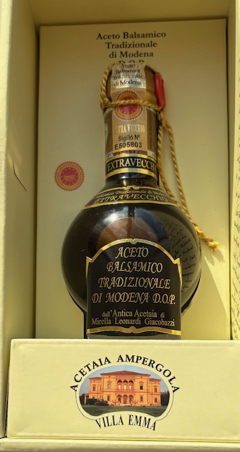 Modena is a city in Italy’s Emilia-Romagna region and is renowned for its BT, as well as its cars (think Ferrari). The aging process, done in barrels called “batteria” (see photograph above), imparts wine-like qualities to BT. If you look closely at the photograph below, you will see “D.O.P,” a number on the seal, and the word “Extravecchio,” which indicates that the product has undergone a minimum of 25 years of aging in wood. There are a number of grapes used in the production of BT, but Trebbiano is the main variety here.